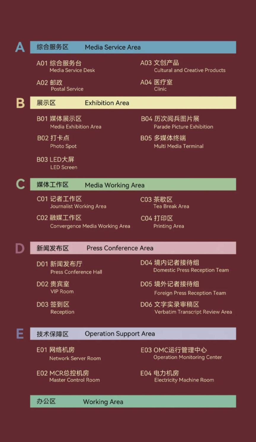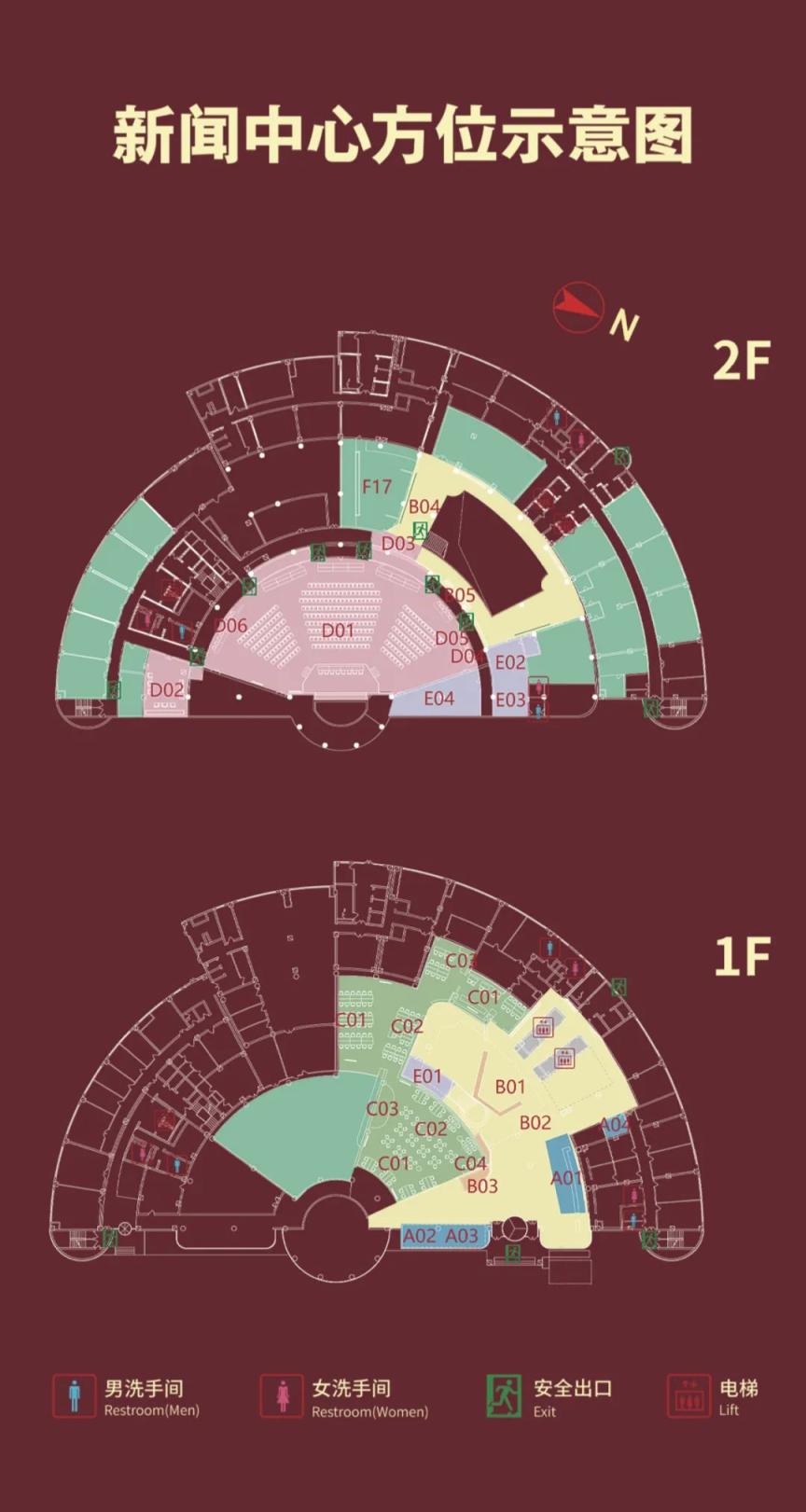 新闻中心服务区域设在梅地亚中心一楼和二楼。具体服务区域如下: