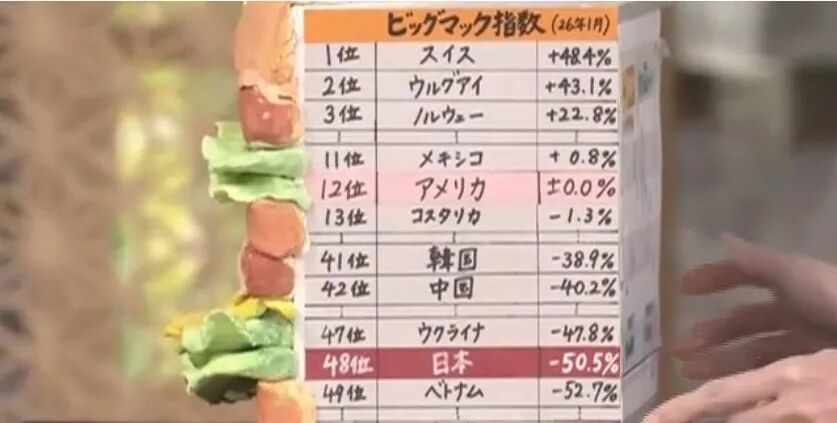 但现实是残酷的。在美国一个巨无霸卖6.12美元,按现在的汇率折合日元约970日元。但在日本却只要500日元。这也意味着,日元的价值只有美元的一半左右。