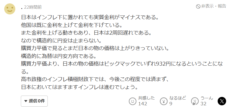 尽管日本已处于通胀环境中,但实际利率依然为负。相比之下,其他国家早已完成加息周期,并开始降息,甚至有再次加息的趋势,日本已经明显落后两个周期。因此,从结构性角度来看,日元贬值难以逆转。从购买力平价角度来看,日本物价仍未完全反映其应有水平,汇率结构性仍将维持日元贬值趋势。按此推算,日本的商品价格,例如巨无霸汉堡,最终可能升至932日元。在高市政权实施积极财政和通胀导向政策的背景下,未来通胀恐怕不会止于这一水平,日本的通胀压力还将进一步加剧。