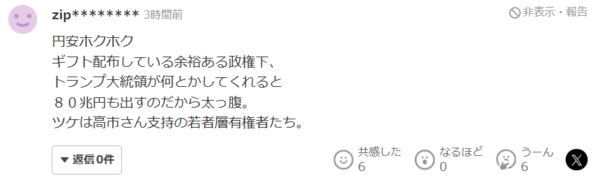 日元贬值让某些人赚得心满意足。这个政权还有余力到处撒钱发福利,还指望特朗普总统能想办法解决问题,甚至豪气地拿出80万亿日元。而最终为此买单的,将是支持高市的年轻选民群体。
